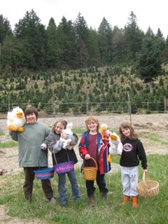 On Easter Saturday, we started our day with me getting home from work at 8am. We then went to karate. We had an upcoming belt test, so needed to get as much time in as possible. Our Sensei owns a Christmas Tree Farm which is on a hillside. It is a really nice place. Well, she has an Easter egg hunt there every year for the kids. We decided we would go there, usually we go to the Buckley Fire Dept hunt, but wanted to do something different. South King also had a hunt, but I didn't really want to head back up to Federal Way for the day. Anyway, it was a really neat hunt. Our friends, the Price's came. They had taken care of the farm while we were gone, so it was great to see them. The kids had a blast and came away with some great loot.