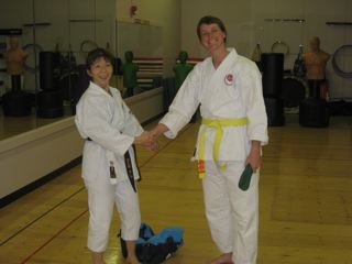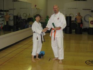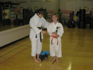 We had our belt test yesterday. Jeff, Audun, and Kajsa were testing for their green belts. I was testing for my orange with the possibility of green. Every once in a while adults are able to skip belts. Usually it's because of a missed test or previous experience. Jeff had skipped his yellow belt, but I didn't get to. This time I was allowed to. We all did a really good job. The kids looked great. Tonight at class we were given our green belts. This is the 4th belt in our system. We have purple, brown, and black left. Now, each of them have at least 2 test levels so they take longer. The kids will stay green until after Nationals in November, unless our Sensei wants them to go as purples, but I doubt it. I think they should go as greens because they will be very proficient at their stuff. We are loving karate. It is a lot of fun. I also really like the respect that is taught through karate. It's amazing to watch the kids "get it". What other things teach "respect" now days.