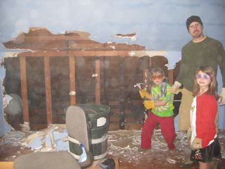 We started taking down wall board in the farm house yesterday to see what was behind the walls. We assumed that there wouldn't be any insulation, but we didn't know what we would find. A friend of ours is helping us with the electrical system, so we decided it would be good to have the walls down for him. The kids thought it was so fun helping. What better than knocking down walls.