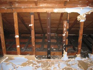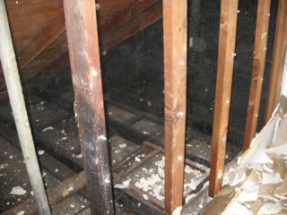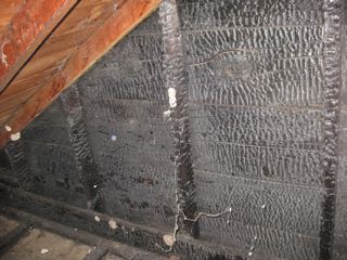 The crazy thing is that the roof was built right on top of the charred 2x4's. Also, the wallboard was put up right over the burned area of the house. It's crazy!! I'm actually really amazed that this house didn't burn down.